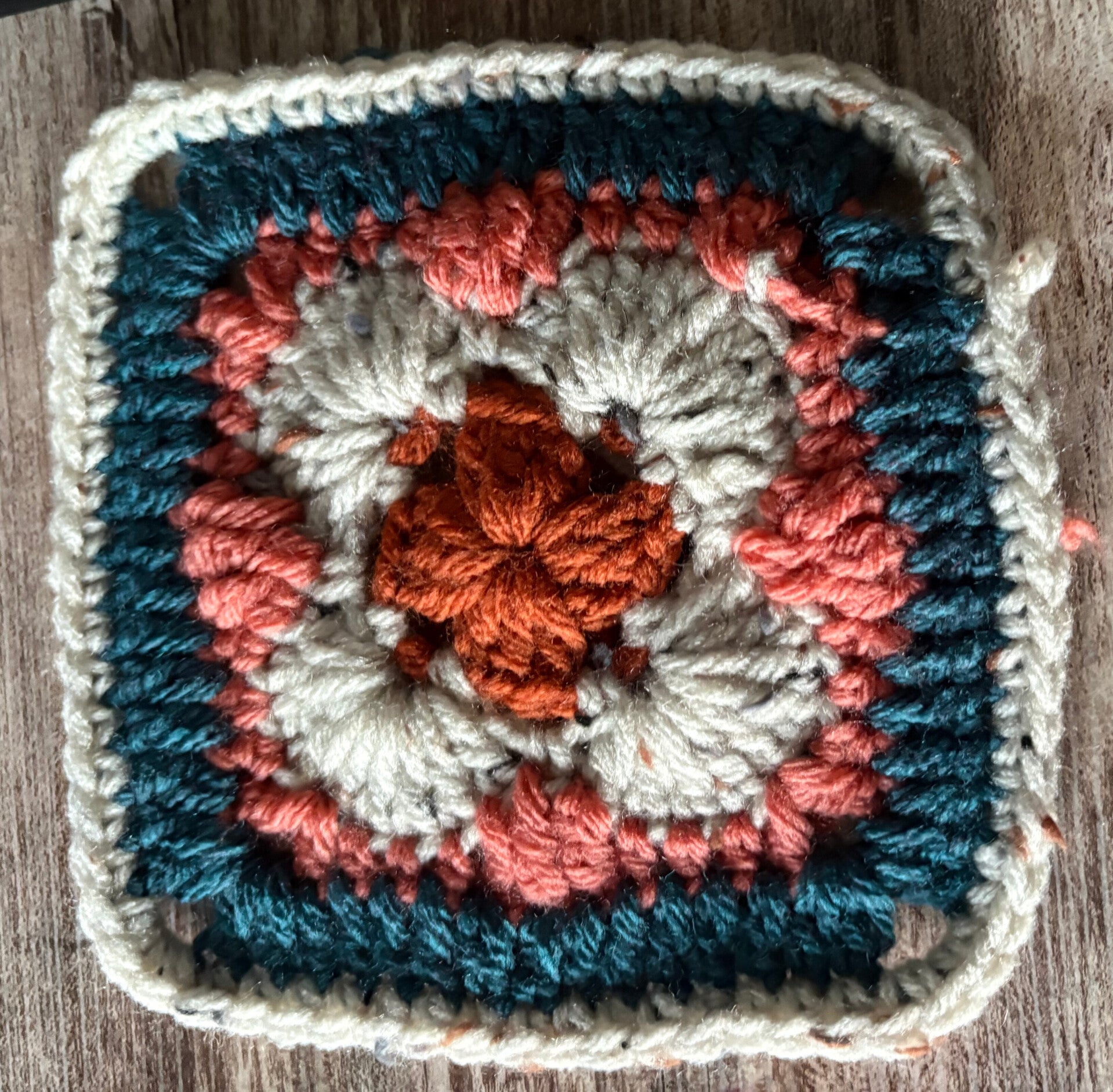 β¨ Done! You now have a popcorn-centered granny square with a bold textured middle and lacy edges.